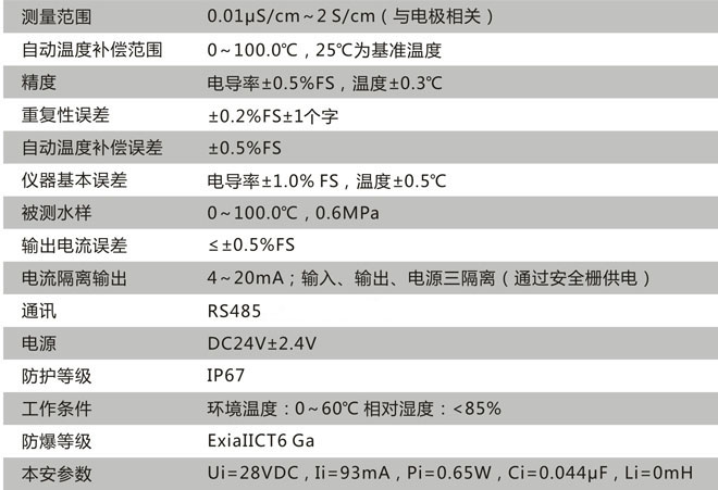 變送器采用防爆鑄鋁外殼,密封性能好防護等級最高可達IP67,特別適用于現場環境惡劣、不宜人員久留的工業場所。配上常數為1.0或10的電極可測量一般液體的電導率;配上0.1或0.01的電極,能準確測量純水或超純水的電導率,特別適用于電廠鍋爐給水和蒸汽冷凝水等高純水的電導率在線連續監測。