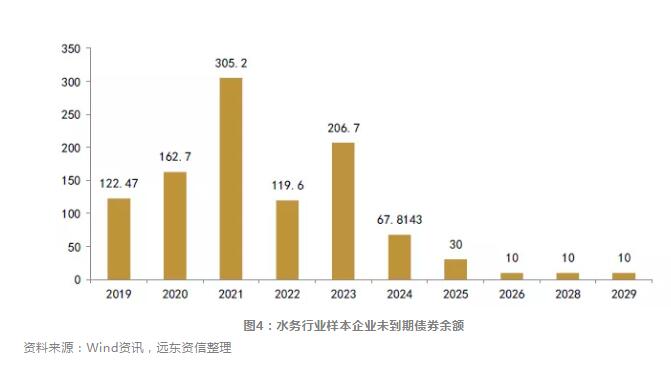 截至2019730日,樣本企業存續債券余額共1044.48億元(圖4)。其中,多數債券集中在2021年到期,共305.2億;其次是2023年,共有206.7億債券到期。2019年,36家樣本企業共有112.47億債券到期,面臨一定的償債壓力和再融資壓力。