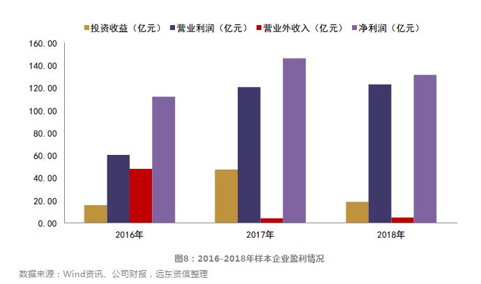 投資收益方面,2018年,樣本企業實現投資收益合計18.83億元,較2017年同期減少28.55億元,投資收益占營業利潤的比重為15.30%,同比下降24.16個百分點(圖8)。其中,2017年,中國水務投資有限公司因轉讓子公司股權導致當期投資收益大幅增長,為21億元,提高了2017年的投資收益。2018年,樣本企業投資收益維持增速穩定,最高為重慶市水務資產經營有限公司,投資收益為4.59億,公司持有西南證券、重慶銀行等優質股權的投資收益和理財收益。綜合來說,2018年樣本企業營業利潤仍主要來自主營業務收入。