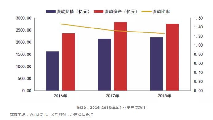 從樣本企業的負債結構來看,截至2018年底流動負債合計為2196.45億元,占總負債比重為36.81%;非流動資產為3005.62億元,占總資產比重為58.95%(圖10)。流動比率為1.25,較2017年末下降0.07。債務期限結構略有改善,負債結構總體仍偏長期,面臨的再融資和短期償付壓力相對較小。