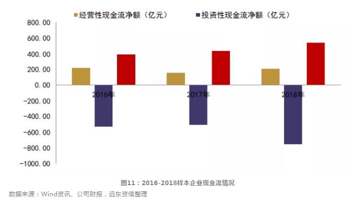 從投資性現金流情況來看,固定資產投資目前仍是水務行業的重點,在政策推動下樣本企業購建固定資產、無形資產和其他長期資產支付的現金近年來快速增長,除此之外,近年來水務行業并購頻繁,并購支出也是水務企業一大資金需求。由于水務企業經營性現金流較為充裕,因此大部分企業在現金儲備充裕時選擇進行短期理財投資,該因素也造成了較大規模的投資性現金收支,但對投資性現金流量凈額影響相對較小。201620172018年,樣本企業投資活動產生的現金流量凈額分別為-531.73億元、-507.28億元和-753.83億元,呈持續大額凈流出狀態。