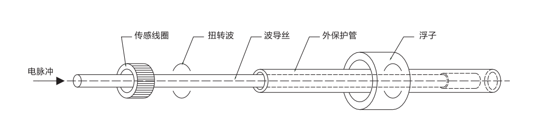 韋德曼效應(yīng)原理:脈沖發(fā)生器產(chǎn)生的電脈沖沿外保護(hù)管內(nèi)的波導(dǎo)絲傳遞,根據(jù)電磁場理論,電脈沖同時伴隨一個環(huán)形磁場以光速向前傳遞,當(dāng)該環(huán)形磁場遇到浮子中永久磁鐵的縱向磁場時,將形成一個螺旋形磁場,它作用于波導(dǎo)絲上并使之扭轉(zhuǎn),從而產(chǎn)生超聲扭轉(zhuǎn)波,該超聲扭轉(zhuǎn)波返回到傳感線圈(變換器)時轉(zhuǎn)換成橫向應(yīng)力,使通過傳感線圈的磁通發(fā)生變化,從而在傳感器線圈兩端產(chǎn)生感應(yīng)電壓, 這樣可以通過精確測量發(fā)射脈沖和返回扭轉(zhuǎn)波的時間差來確定浮子的精確位置。