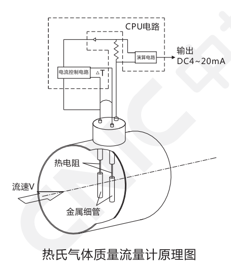 熱式氣體質(zhì)量流量計(jì)基于熱擴(kuò)散原理,即利用流體流過發(fā)熱物體時(shí),發(fā)熱物體的熱量散失多少與流體的流量成一定的比例關(guān)系,具體來說,流量計(jì)的傳感器有兩支標(biāo)準(zhǔn)級的RTD,一支用來做熱源,一支用來測量流體溫度,流體經(jīng)過時(shí),熱源的熱量損失與流量的大小成線性關(guān)系,熱式氣體質(zhì)量流量計(jì)就可以把這種關(guān)系轉(zhuǎn)換成測量流量信號的線性輸出。