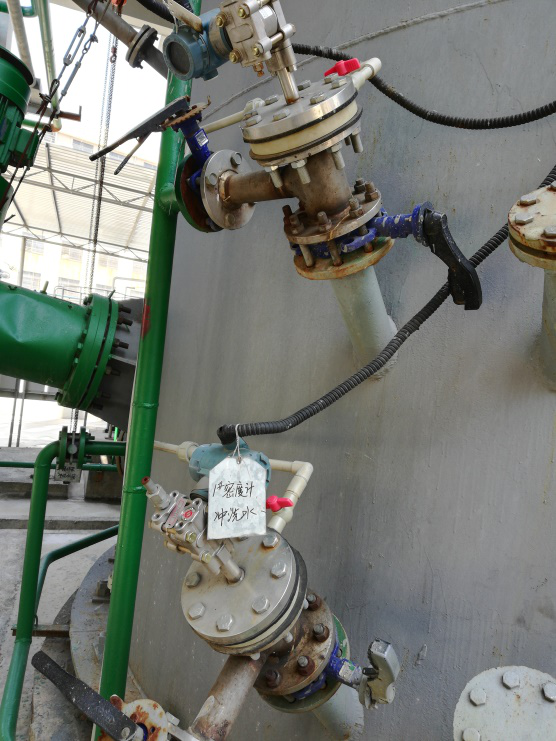 吸收塔漿液密度計(jì)控制著塔內(nèi)石膏漿液的排放,保持塔內(nèi)物料的平衡。若濃度低于某一定值,漿液需打回吸收塔再循環(huán),若濃度高于設(shè)定值,則打至一級(jí)脫水系統(tǒng)。如果顯示不準(zhǔn)確,特別是顯示數(shù)值偏低時(shí),容易造成由于實(shí)際液位偏高造成的漿液倒灌等影響脫硫系統(tǒng)安全運(yùn)行的問(wèn)題,密度計(jì)顯示不準(zhǔn)確,還容易造成塔內(nèi)漿液排出難以控制,特別是在顯示密度偏低的情況下,塔內(nèi)實(shí)際密度較高,可能會(huì)造成漿液濃度過(guò)飽和度偏高,出再嚴(yán)重的結(jié)垢現(xiàn)象。