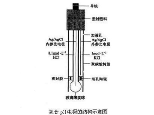 對于ph電極。它是一支端部吹成泡狀的對于pH敏感的玻璃膜的玻璃管。管內(nèi)充填有含飽和AgCl的3mol/lkcl緩沖溶液,pH值為7。存在于玻璃膜二面的反映PH值的電位差用Ag/AgCl傳導(dǎo)系統(tǒng),如第二電極導(dǎo)出。PH復(fù)合電極如圖