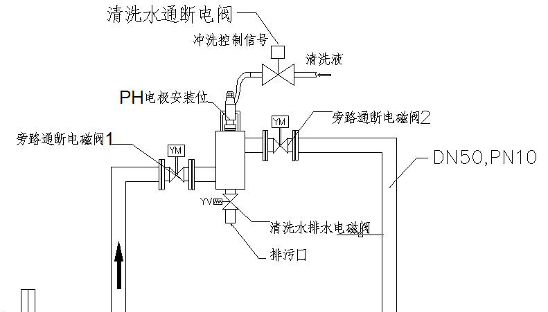 3.清洗過程結(jié)束,通過控制電路開啟旁路通斷電磁閥1和2,關(guān)閉清洗水通斷電磁閥和清洗水排水電磁閥,此時介質(zhì)正常從旁通管內(nèi)流通回到主工藝管路,繼續(xù)介質(zhì)的PH在線測量;