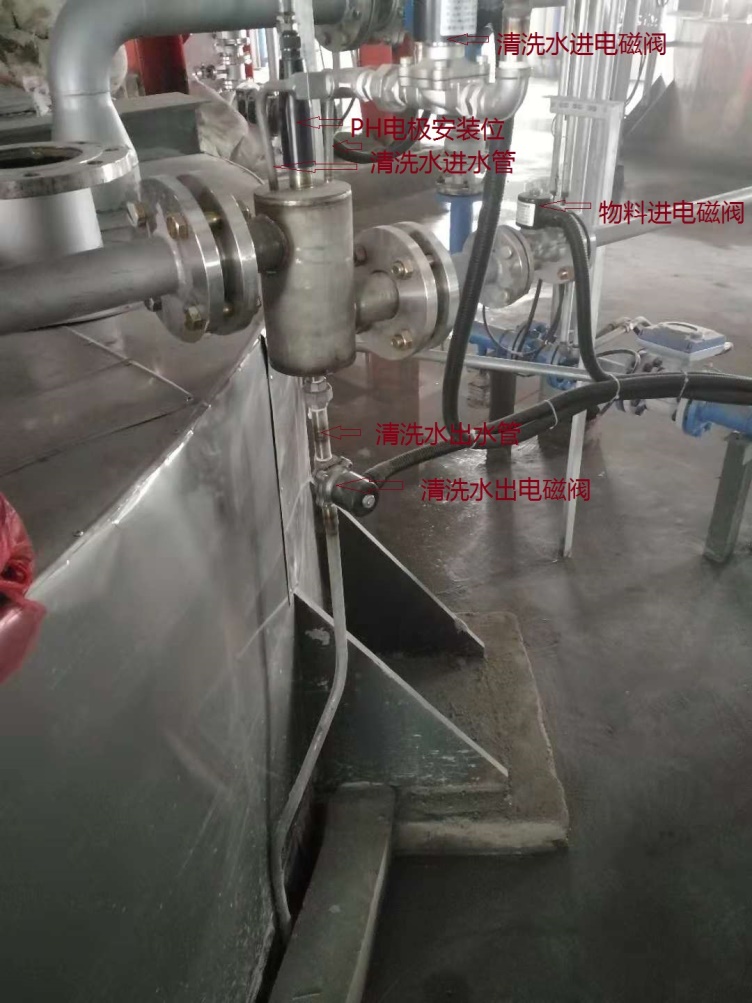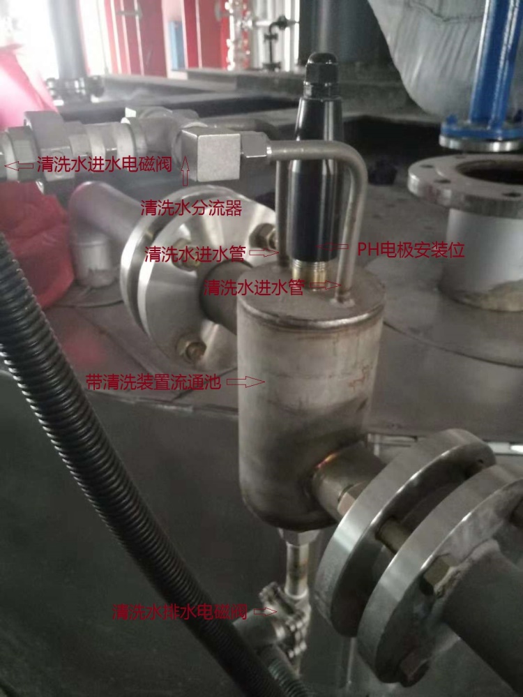 通過特別設(shè)計的流通池,在設(shè)定的時間利用沖洗泵抽取清水對PH傳感器進行沖洗,沖洗過程中利用電磁閥控制物料管路和沖洗管路的關(guān)閉,這樣一方面既能保證測量的準確度并減少傳感器的損耗,增長了傳感器的使用壽命,同時不會讓清洗水流入到物料內(nèi)。