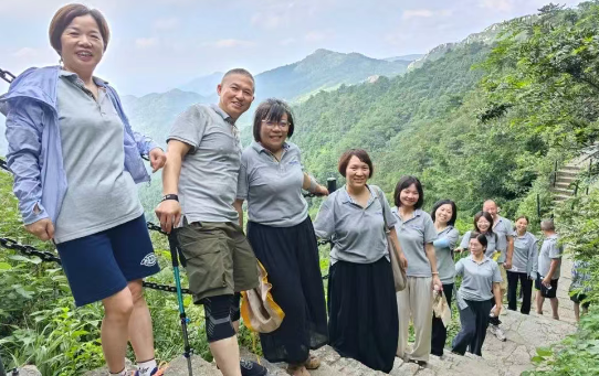 次日早晨,全體集合,一同前往美麗的天臺山風景區爬山。隊伍沿著石階緩緩向上,待到登上頂峰,風拂過臉頰,帶著山巔的清爽,遠處的云海翻涌著與天際相接,腳下的群峰在晨光里若隱若現。這一刻,所有的汗水都成為了最美好的回憶。